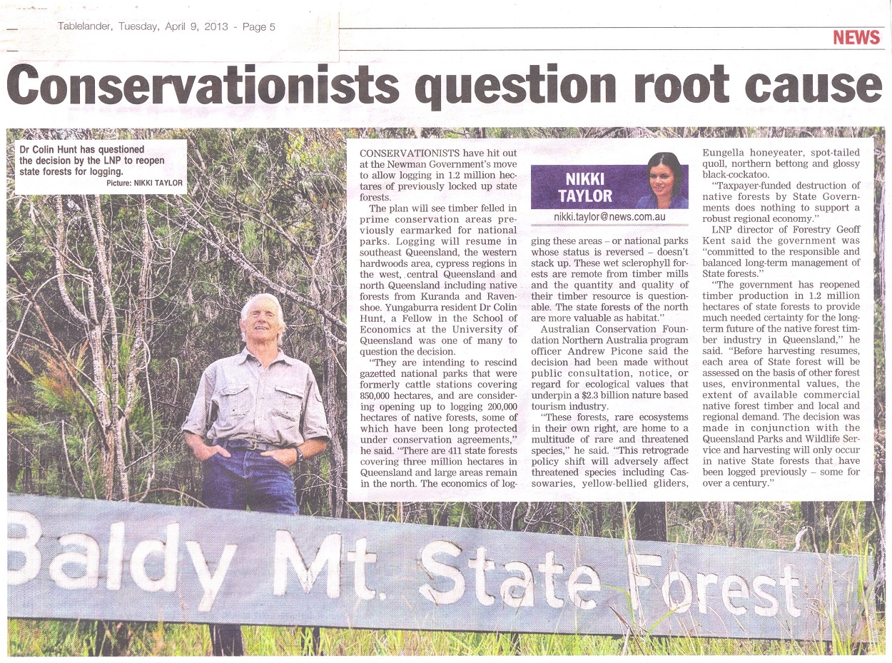 - Colin Hunt and Nikki Taylor, 2013. Conservationists question root cause, The Tablelander, April 9: Colin_State_Forests_resized.jpg